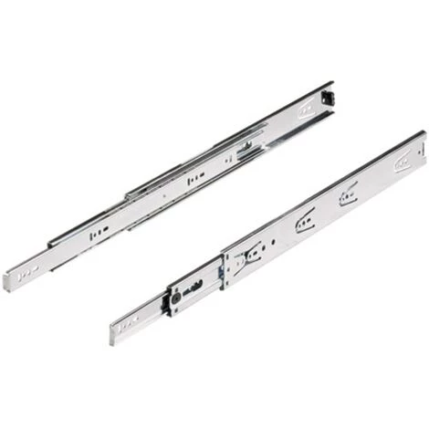 Cette coulisse à bille Hettich est utilisée pour les tiroirs de meubles et peut supporter des charges plus lourdes qu’une coulisse à galets.