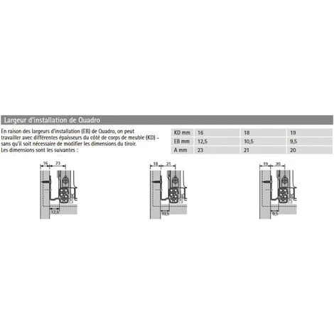 - Toutes les versions de coulisses Quadro sont interchangeables entre elles sans modification des dimensions de caisson, de tiroir ou de façade