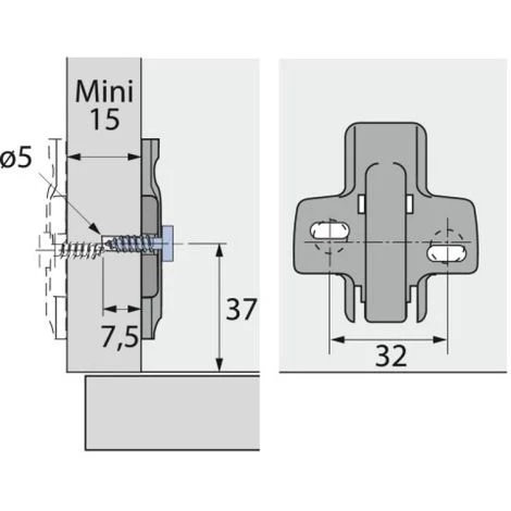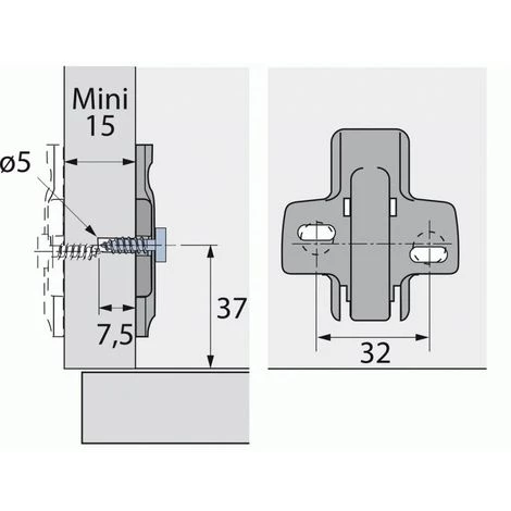 Pour montant d’épaisseur mini. 15 mm. Distance de perçage 32 mm. Acier nickelé. Écart. série de perçage : 37 mm.