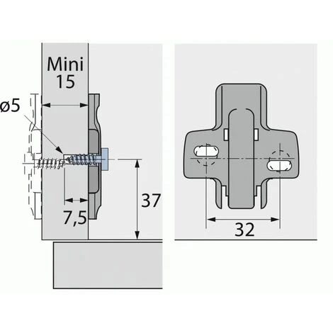 Pour montant d’épaisseur mini. 15 mm. Distance de perçage 32 mm. Acier nickelé. Écart. série de perçage : 37 mm.