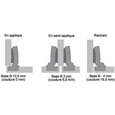 Matériau boîtier de charnière : Acier nickelé Spécificités: Réglage du recouvrement intégré +/- 2mm