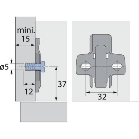 Pour montant d’épaisseur mini. 15 mm. Distance de perçage 32 mm. Acier nickelé. Écart. série de perçage : 37 mm.