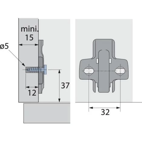 Pour montant d’épaisseur mini. 15 mm. Distance de perçage 32 mm. Acier nickelé. Écart. série de perçage : 37 mm.