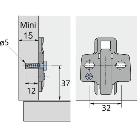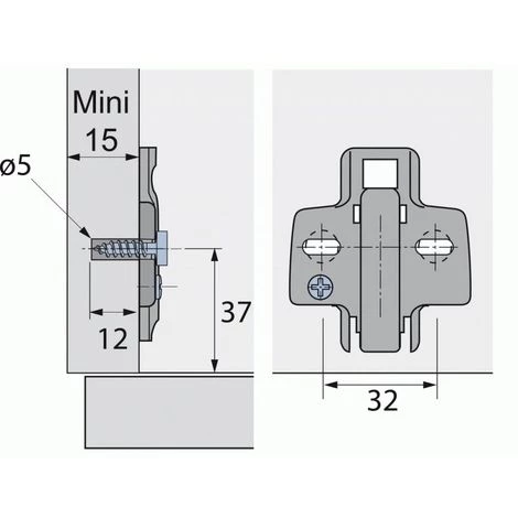 Pour montant d’épaisseur mini. 15 mm. Distance de perçage 32 mm. Réglage en hauteur par excentrique ± 2 mm. Acier nickelé. Écart. série de perçage : 37 mm.