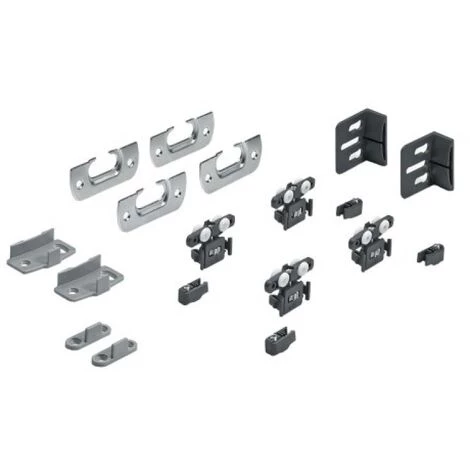 Description Pour un meuble à 2 portes.2 vantaux de 15 kg chacun. Réglage en hauteur sans outil intégré.Kit composé de :-4 pièces de coulissage,-4 butées de fin de course,-4 adaptateurs pour portes en bois,-2 pièces de guidage par le bas pour portes en bois,-2 pièces de guidage par le bas pour portes à cadre en aluminium,-2 butées de porte / dispositifs d’écartement.