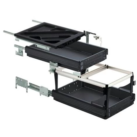 Description Kit composé de :-1 bac à ustensiles de bureau de 40 mm-1 jeu de coulisses pour tiroir Quadro 12, coulisse à sortie partielle avec amortisseur Silent System, capacité de charge 6 kg,-3 tiroir en acier,-1 tiroir en acier avec cadre à dossiers suspendus,-3 paires de coulisses capacité de charge 25 kg : KA270 sortie partielle ou Quadro Duplex sortie totale,-1 jeu de coulisses pour tiroir Quadro Duplex 45, coulisse à super extension, capacité de charge 45 kg,-1 système de verrouillage centralisé Stop Control avec 2 boîtiers de retour automatique Silent System 40 et 2 activateurs,-6 rondelles excentriques, y compris 6 vis de fixation,-1 jeu de supports de façades réglables,-1 serrure à cylindre à levier y compris cylindre intérieur pour ajuster et fixer la façade,-Notices de montage.