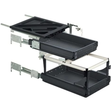 Description Kit composé de :-1 bac à ustensiles de bureau de 40 mm-1 jeu de coulisses pour tiroir Quadro 12, coulisse à sortie partielle avec amortisseur Silent System, capacité de charge 6 kg,-1 tiroir en acier 1 tiroir en acier,1 tiroir en acier avec cadre à dossiers suspendus,-1 jeu de coulisses pour tiroir Quadro Duplex 25, coulisse à sortie totale, capacité de charge 25 kg,-1 jeu de coulisses pour tiroir Quadro Duplex 45, coulisse à super extension, capacité de charge 45 kg,-1 système de verrouillage centralisé Stop Control avec 2 boîtiers de retour automatique Silent System 40 et 2 activateurs,-6 rondelles excentriques, y compris 6 vis de fixation,-1 jeu de supports de façades réglables,-1 serrure à cylindre à levier y compris cylindre intérieur,-Notice de montage.