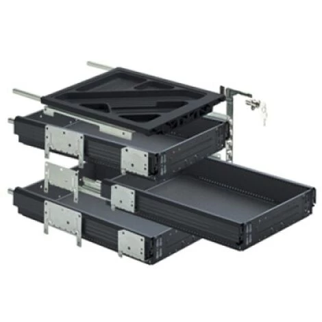 Description Kit composé de :-1 bac à ustensiles de bureau de 40 mm,-1 jeu de coulisses pour tiroir Quadro 12, coulisse à sortie partielle avec amortisseur Silent System, capacité de charge 6 kg,-3 tiroirs en acier,-3 paires de coulisses capacité de charge 25 kg, Quadro Duplex sortie totale,-1 système de verrouillage centralisé Stop Control avec 3 boîtiers de retour automatique Silent System 40et 3 activateurs,-9 rondelles excentriques, y compris 9 vis de fixation,-1 serrure à cylindre à levier y compris cylindre intérieur pour ajuster et fixer la façade,-Notices de montage.
